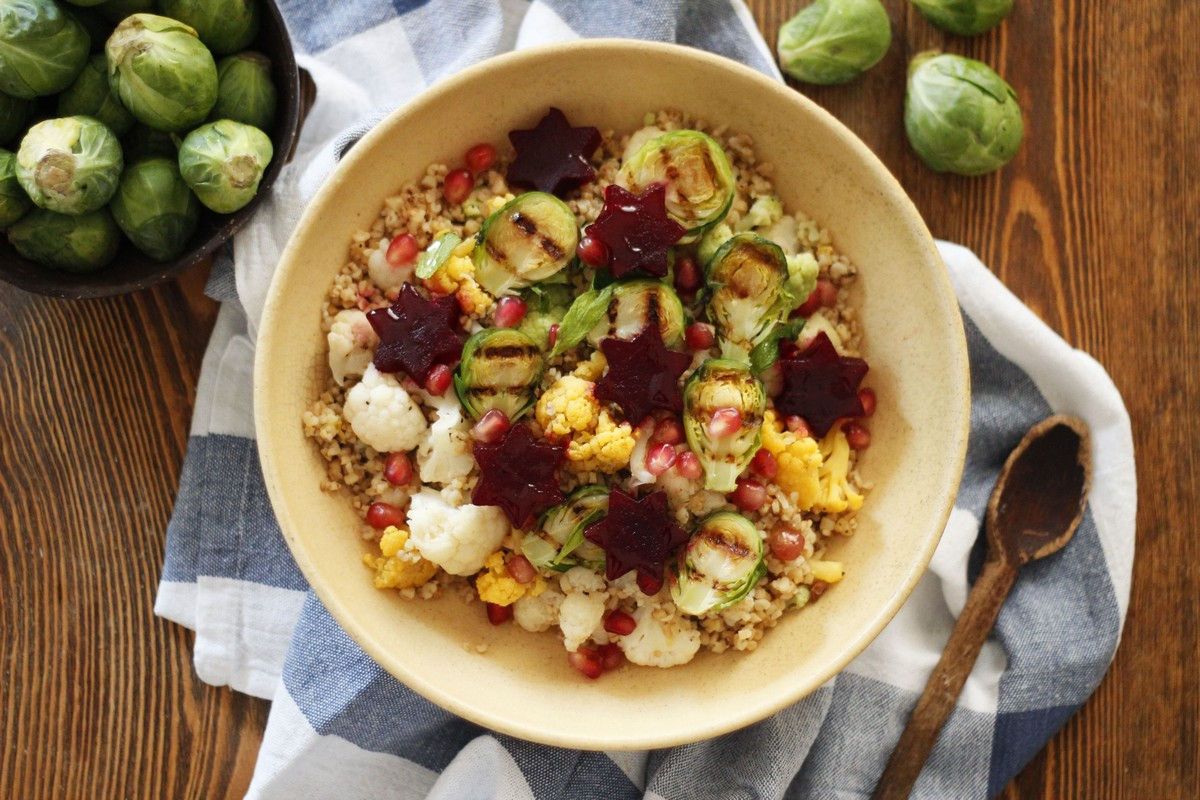 Πλιγούρι με κουνουπίδι, παντζάρι και λαχανάκια Βρυξελλών