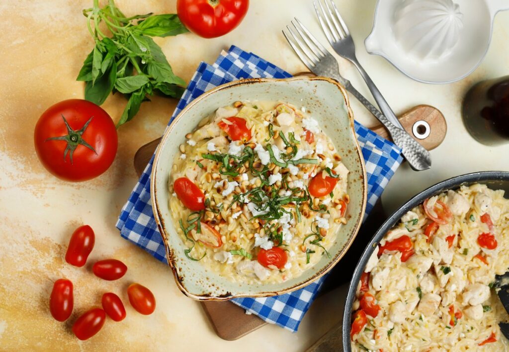 Κριθαρότο με κοτόπουλο, ντοματίνια και βασιλικό