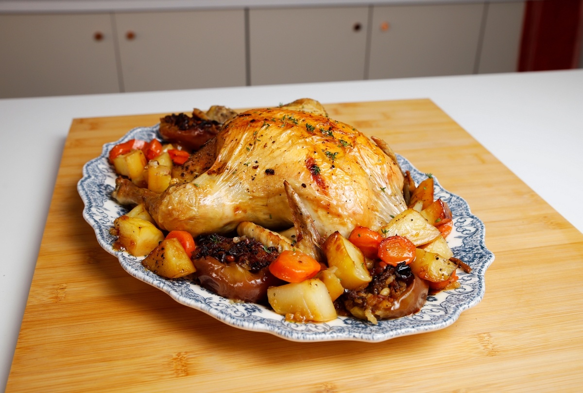 Το γιορτινό γεμιστό κοτόπουλο με κιμά, κάστανα και κουκουνάρι είναι το απόλυτο πιάτο για το τραπέζι των εορτών. Ζουμερό κοτόπουλο γεμισμένο με αρωματικό κιμά,