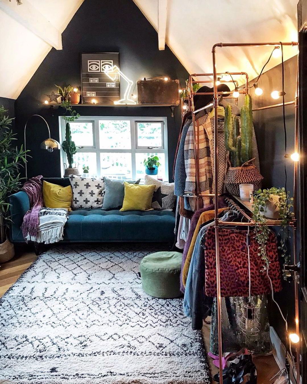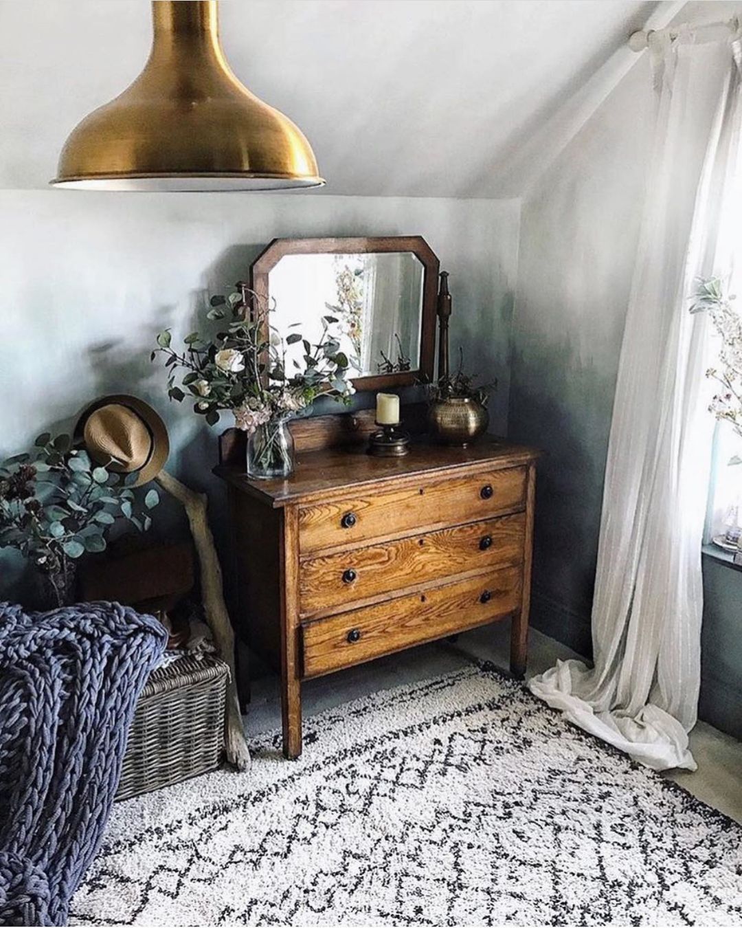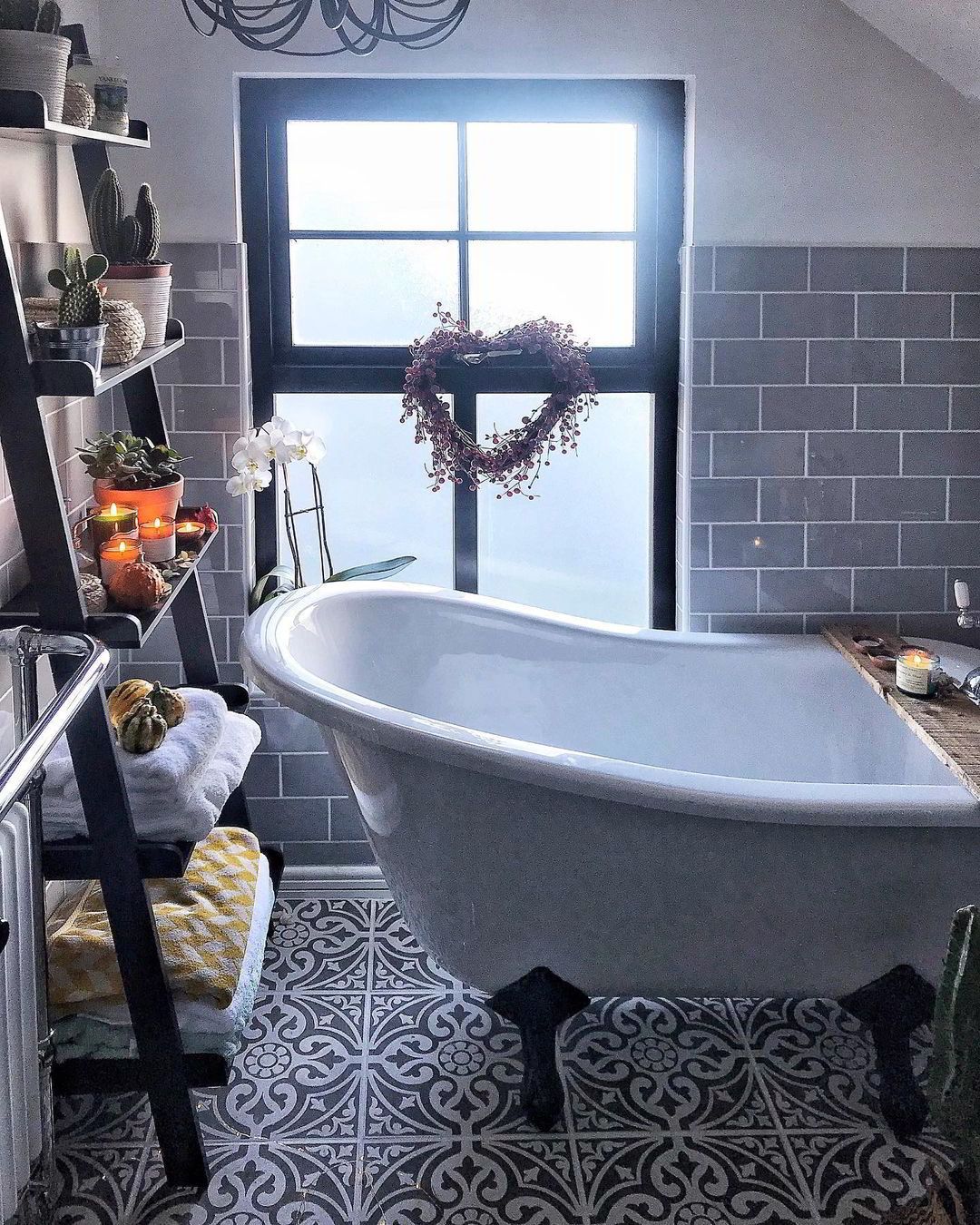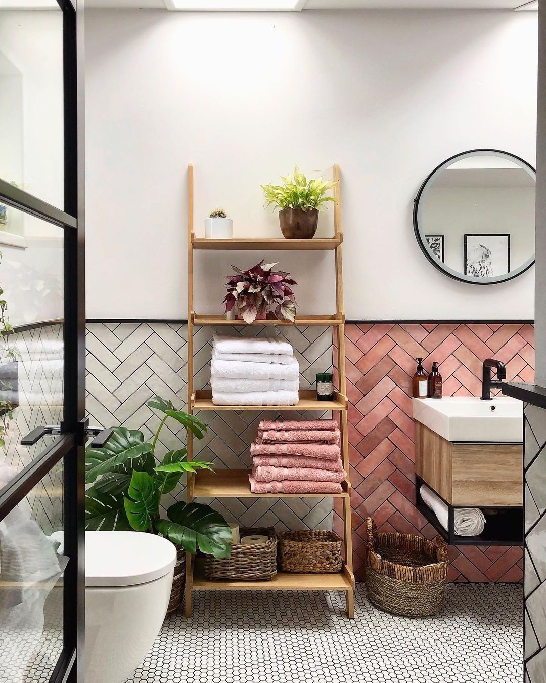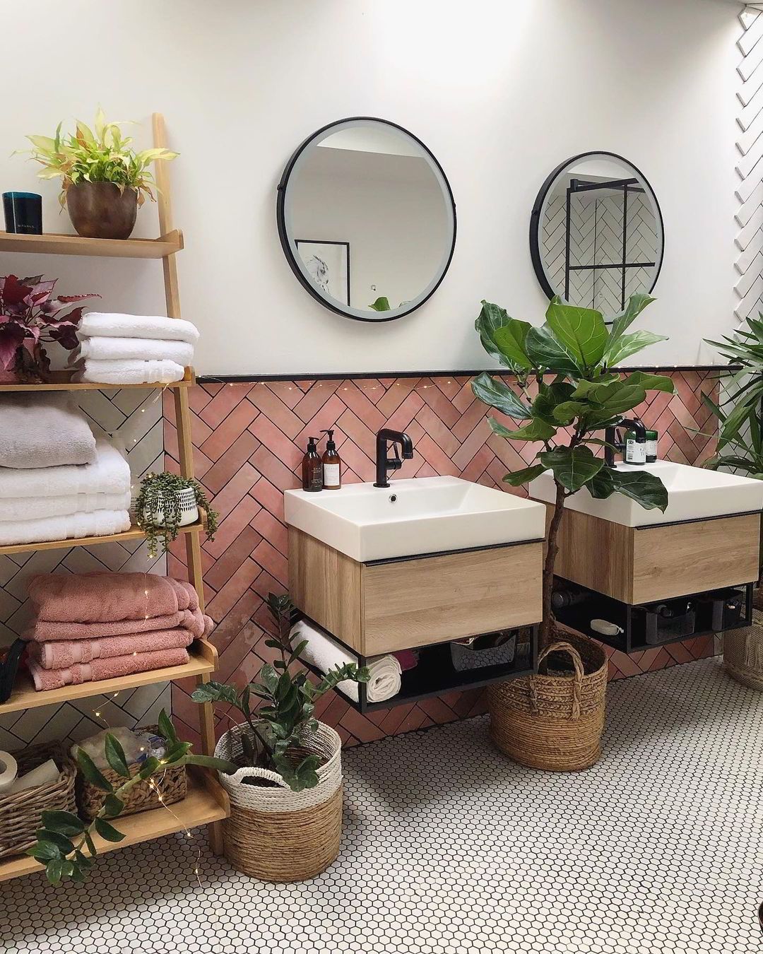 Στο μπάνιο κυριαρχούν οι φεγγίτες που πλημμυρίζουν το χώρο με φυσικό φως. Δίνοντας ιδιαίτερη έμφαση στην λεπτομέρεια, έχει αξιοποιηθεί κάθε σημείο του, δημιουργώντας ένα ξεκούραστο (και αρκετά ευρύχωρο) δωμάτιο. Οι δίδυμοι νιπτήρες με ξύλινη λεπτομέρεια και τα ψάθινα καλάθια δίνουν τις απαραίτητες boho πινελιές. Η vintage μπανιέρα είναι βέβαια αυτή που μονοπωλεί τα βλέμματα.