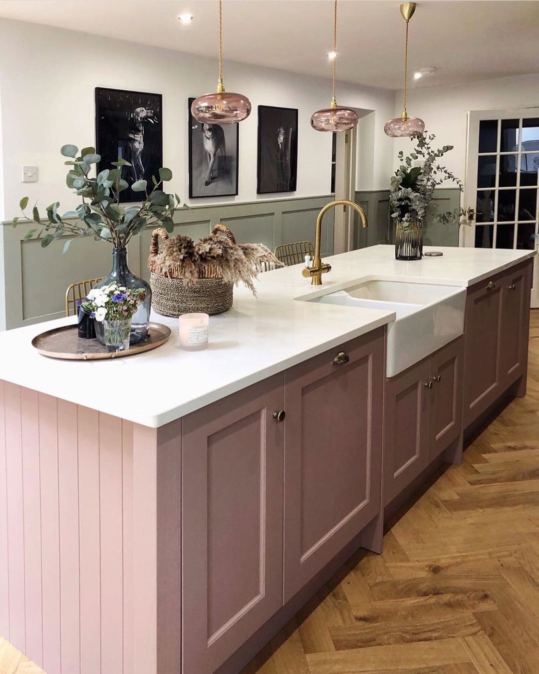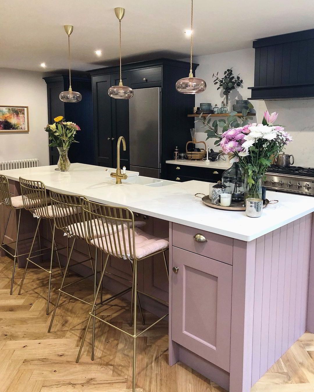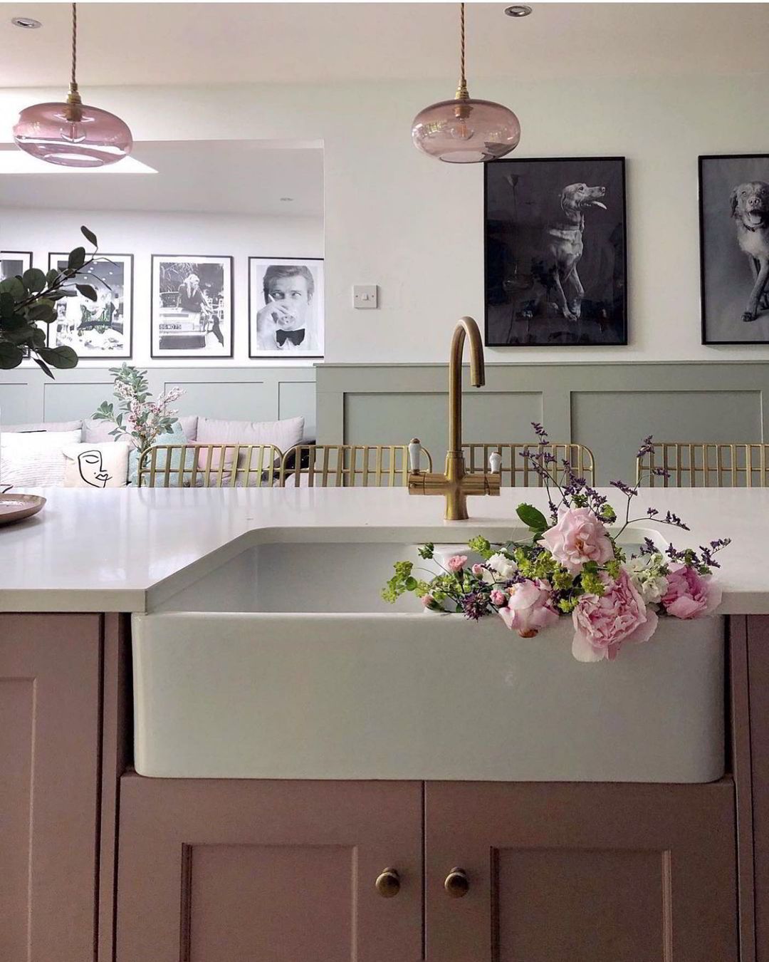 Ένα καλό διακοσμητικό μάθημα που μπορείς να πάρεις από το συγκεκριμένο σπίτι είναι ο τρόπος με τον όποιο έχει χρησιμοποιηθεί και ενταχθεί στο σπίτι το “χρυσό”. Το βλέπουμε στα φωτιστικά, στο τροχήλατο μπαρ, στο μίκτη του νεροχύτη, στα χερούλια των ντουλαπιών αλλά και στα σκαμπό. Υπάρχει σε γενναίες δόσεις, δίνοντας μια αίσθηση πολυτέλειας ενώ παράλληλα διατηρεί τις ισορροπίες.