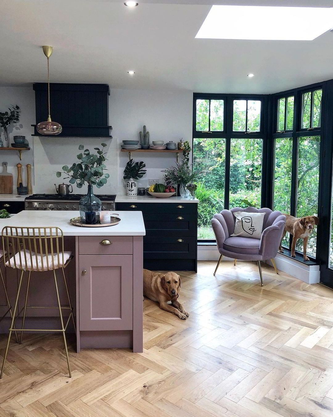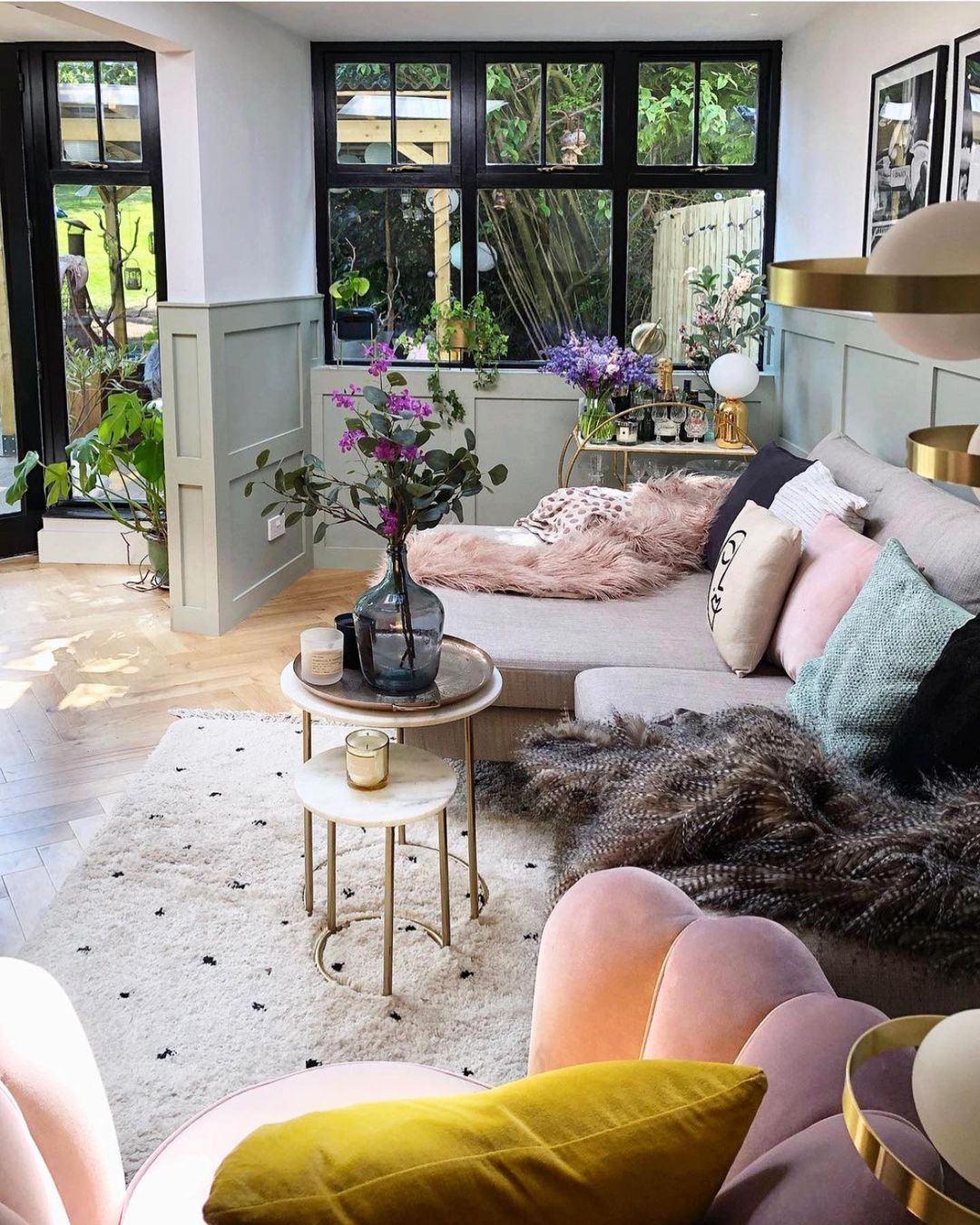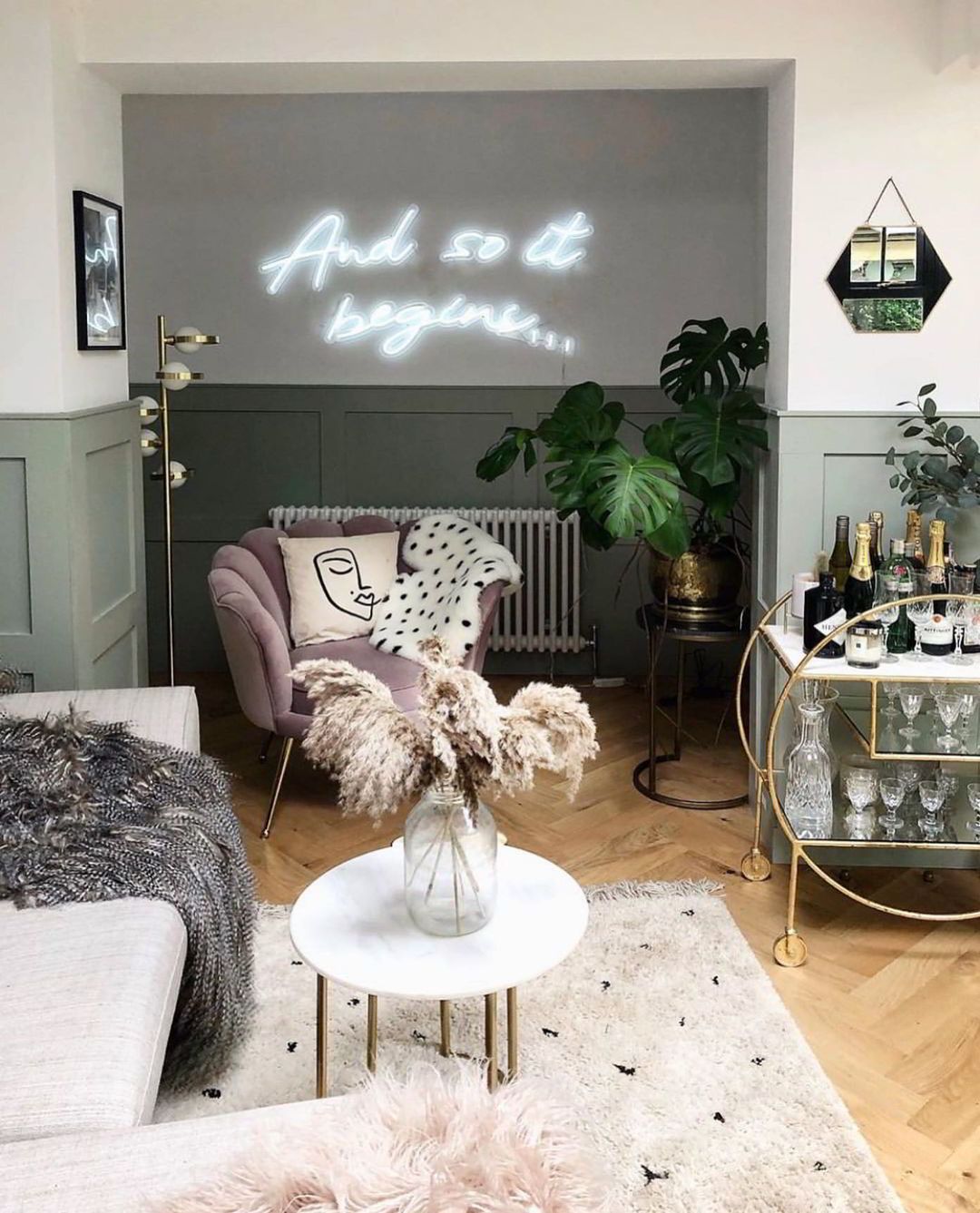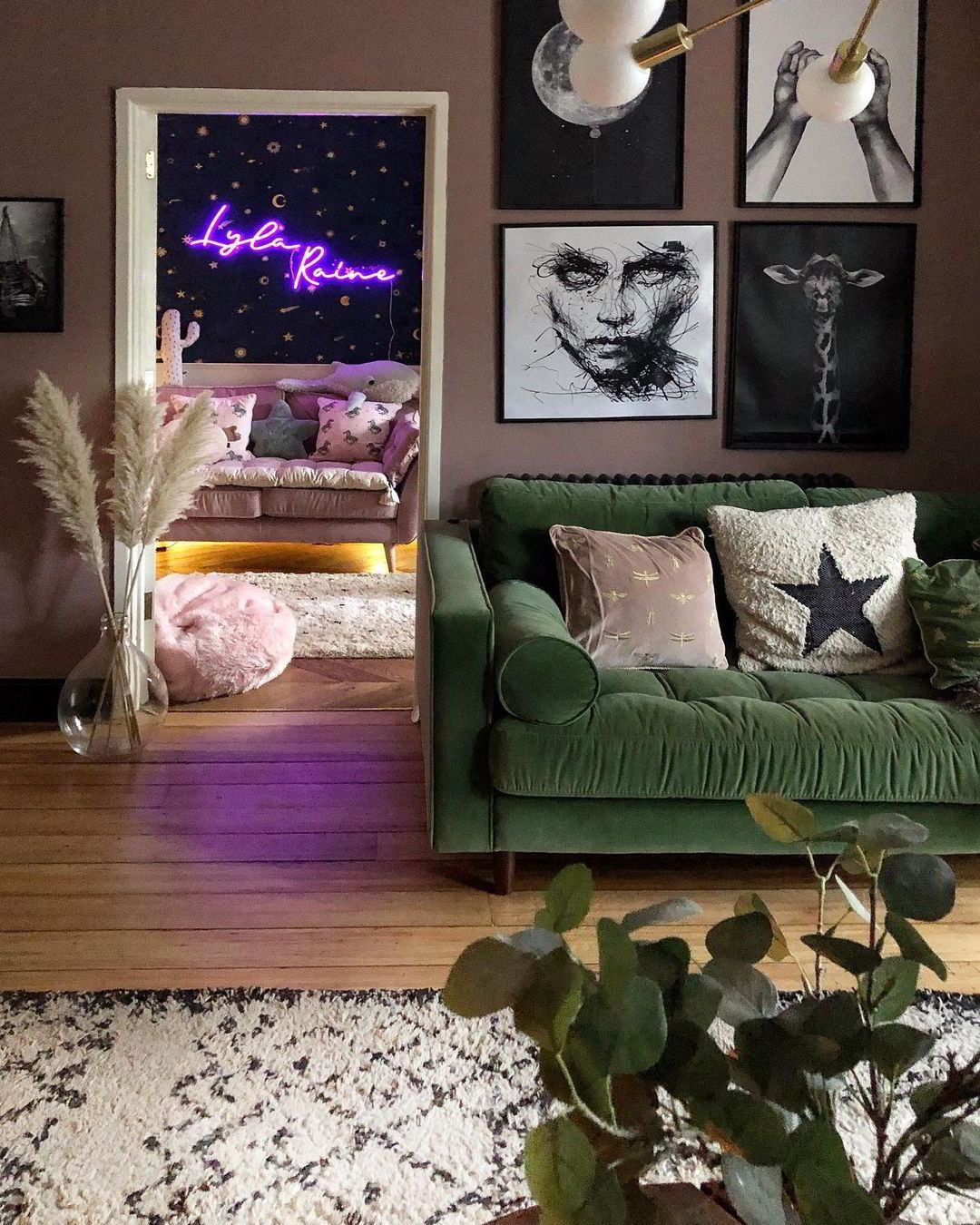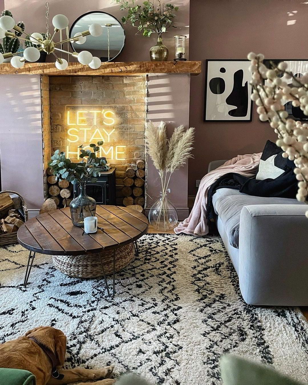 Διατηρώντας την ατμόσφαιρα ζεστασιάς που της δημιούργησε όταν το πρωτοαντίκρισε, η ιδιοκτήτρια φρόντισε να το μετατρέψει στον δικό της οικογενειακό παράδεισο. Στο σαλόνι κυριαρχεί μια ρομαντική απόχρωση του ροζ, η οποία ξεκινά από τους τοίχους, περνά στο τζάκι και εντοπίζεται σε μικροέπιπλα και τις βελούδινες πολυθρόνες. Η ίδια σχεδόν απόχρωση έχει επιλεχθεί για τη νησίδα της κουζίνας. Συμπληρωματικά προς το ροζ λειτουργεί το πράσινο το όποιο έχει χρησιμοποιηθεί για τα ξύλινα πάνελ που ντύνουν το υπόλοιπο καθιστικό αλλά και σε διάφορα έπιπλα και διακοσμητικά. Το κέντρο της προσοχής δεν είναι άλλο από το τζάκι το οποίο έχει διακοσμηθεί με μια νέον επιγραφή με την ένδειξη “Let’s Stay Home”, ιδανικό για την περίοδο της καραντίνας!