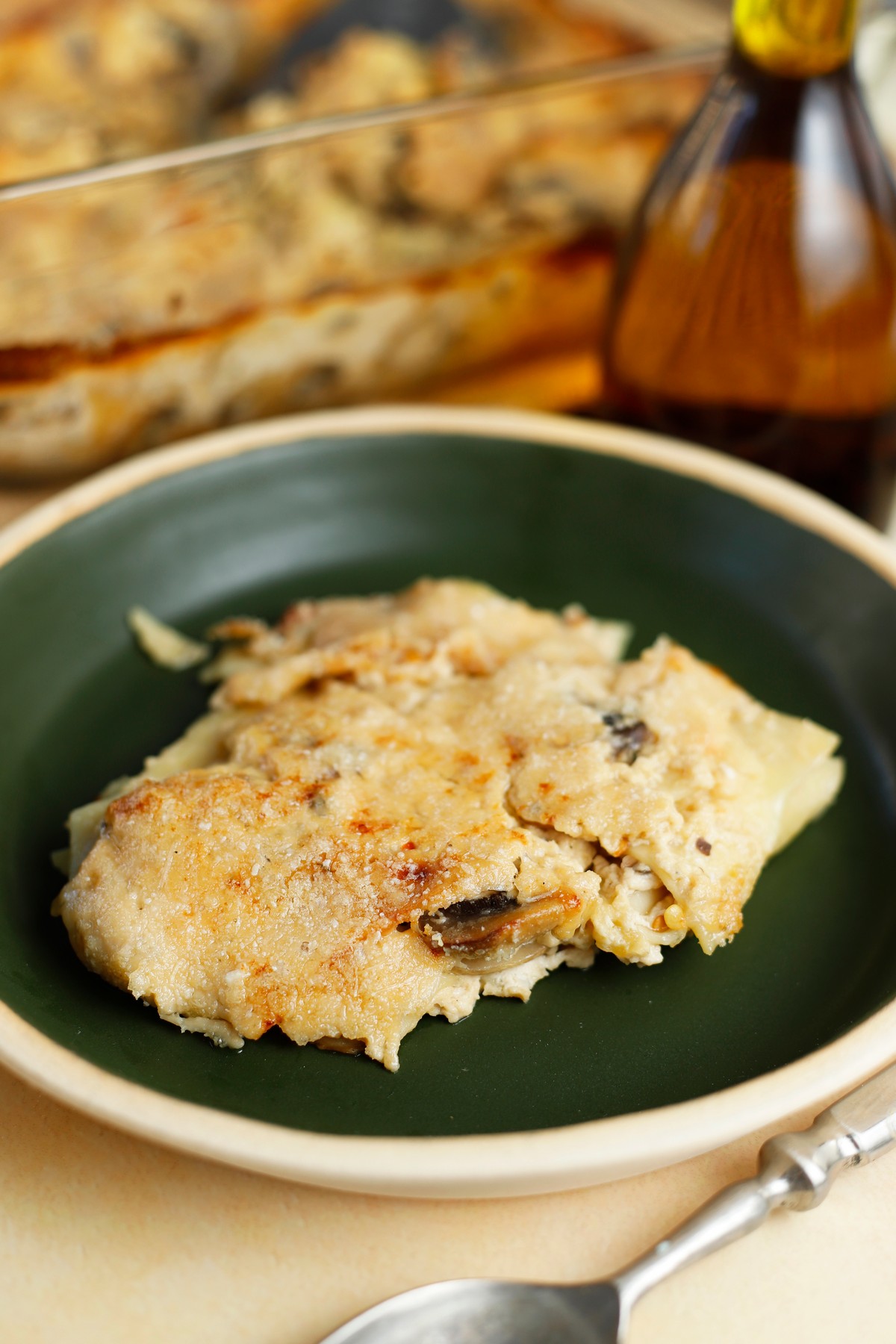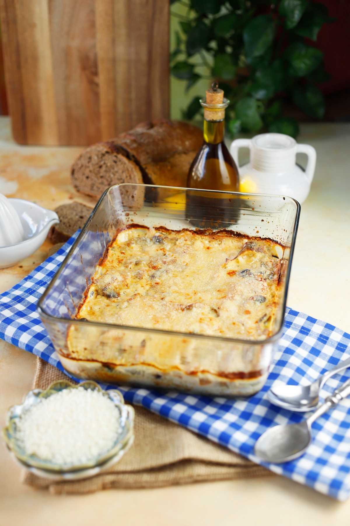 - Βγάζουμε το ταψί από το φούρνο, καλύπτουμε με παρμεζάνα και ψήνουμε για άλλα 7-8 λεπτά να λιώσει το τυρί και να κάνει κρούστα.