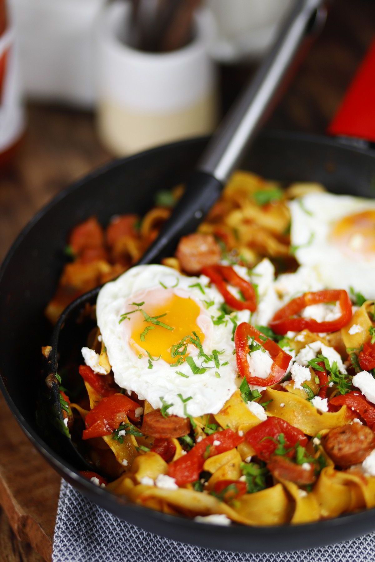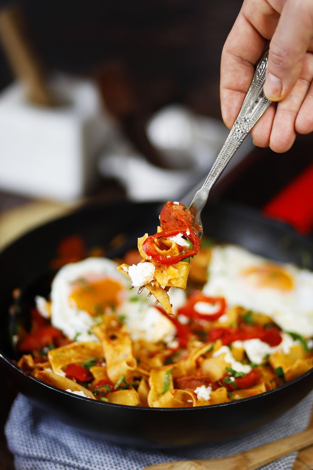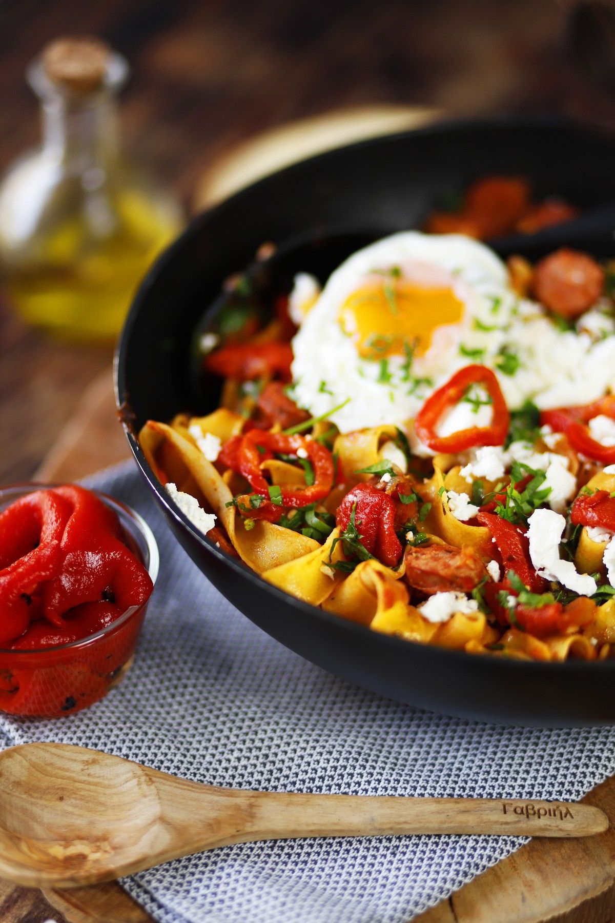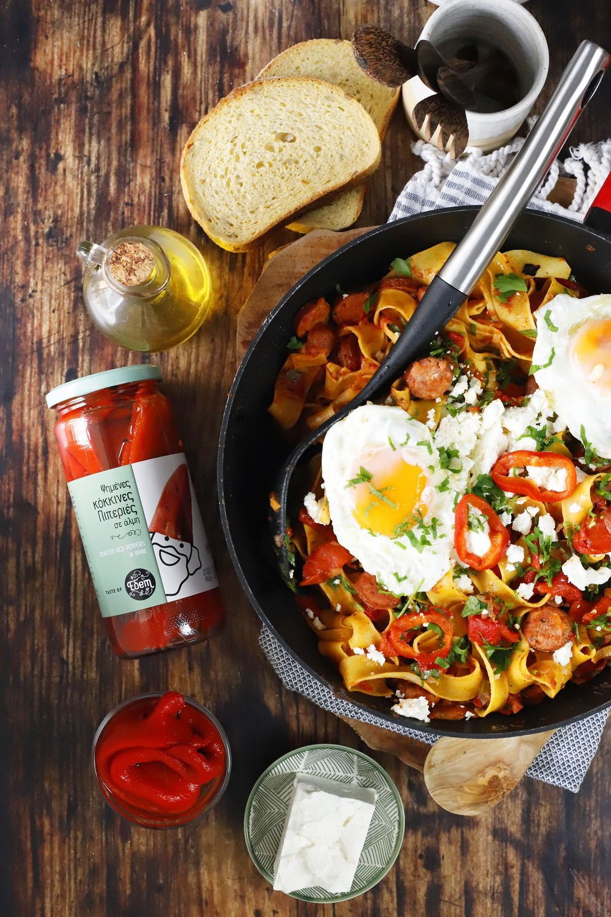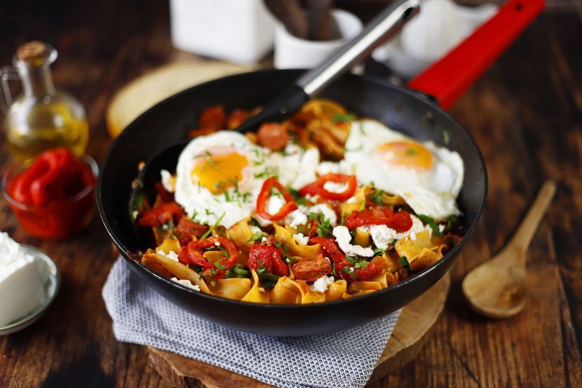 H σημερινή συνταγή εμπνέεται από το πηλιορείτικο σπετζοφάι κι εξελίσεται σε μια μαγική, comfort μακαρονάδα με Ψημένες κόκκινες πιπεριές Εδem, χωριάτικο λουκάνικο και χυλοπίτες.