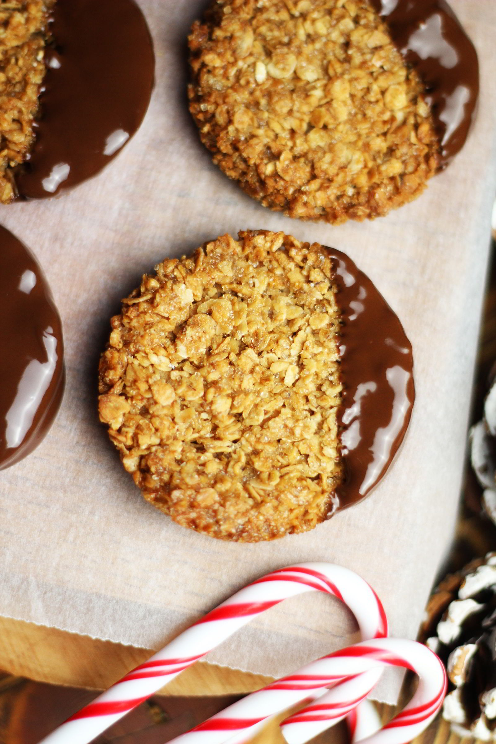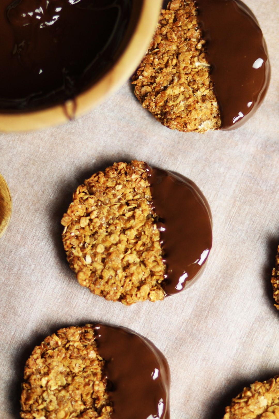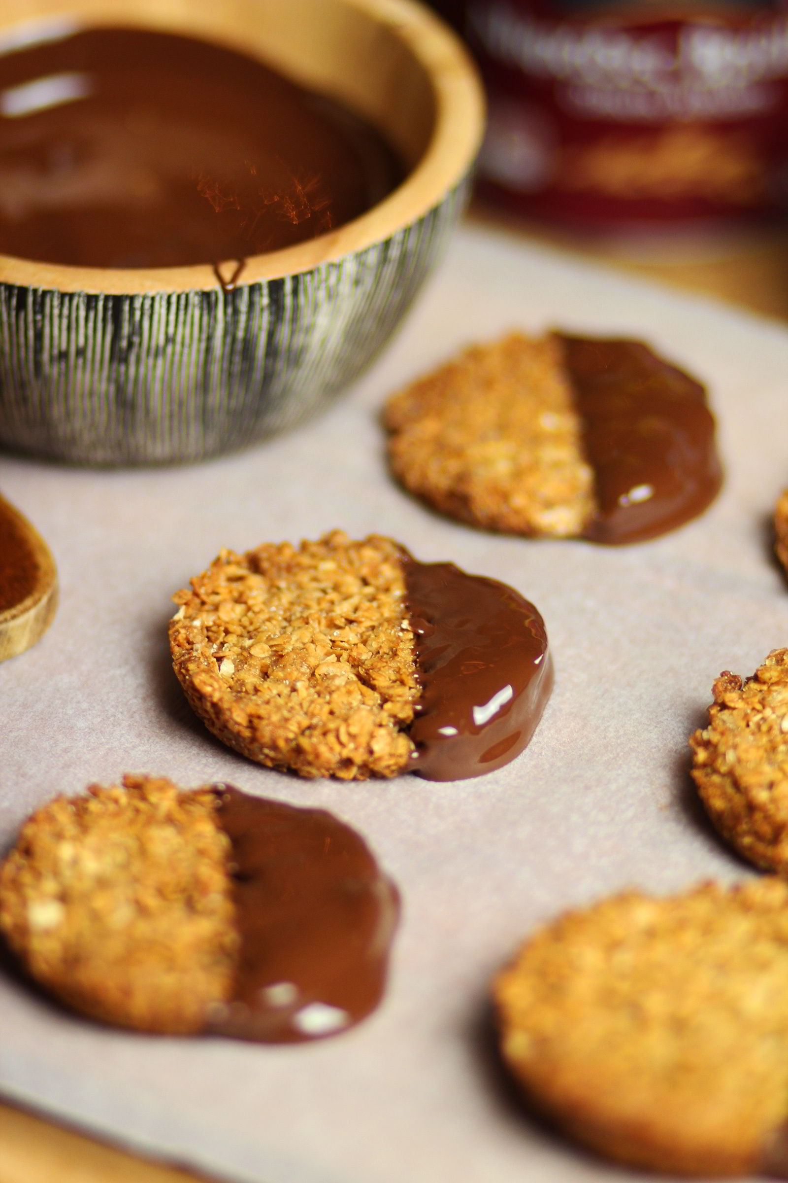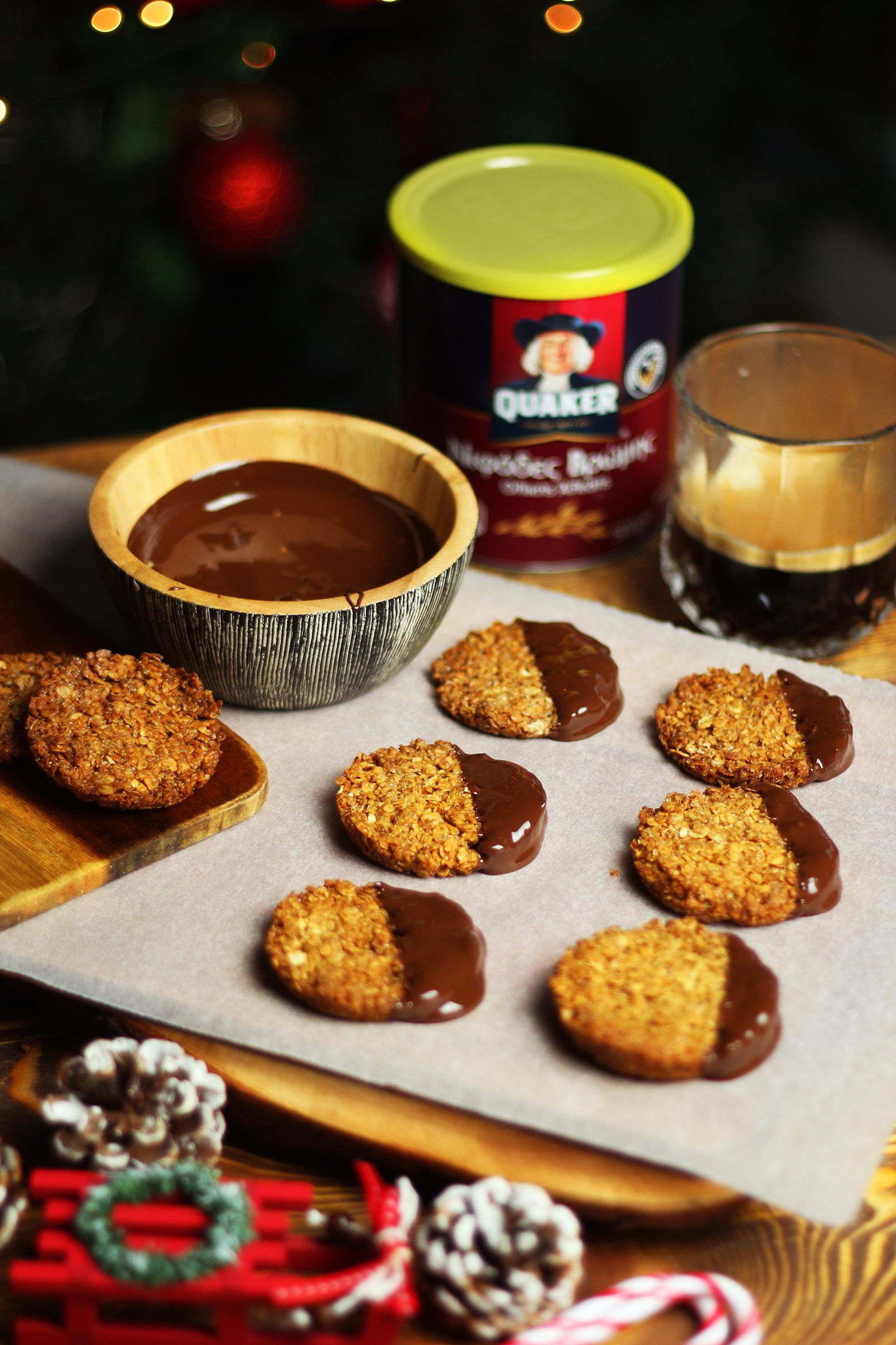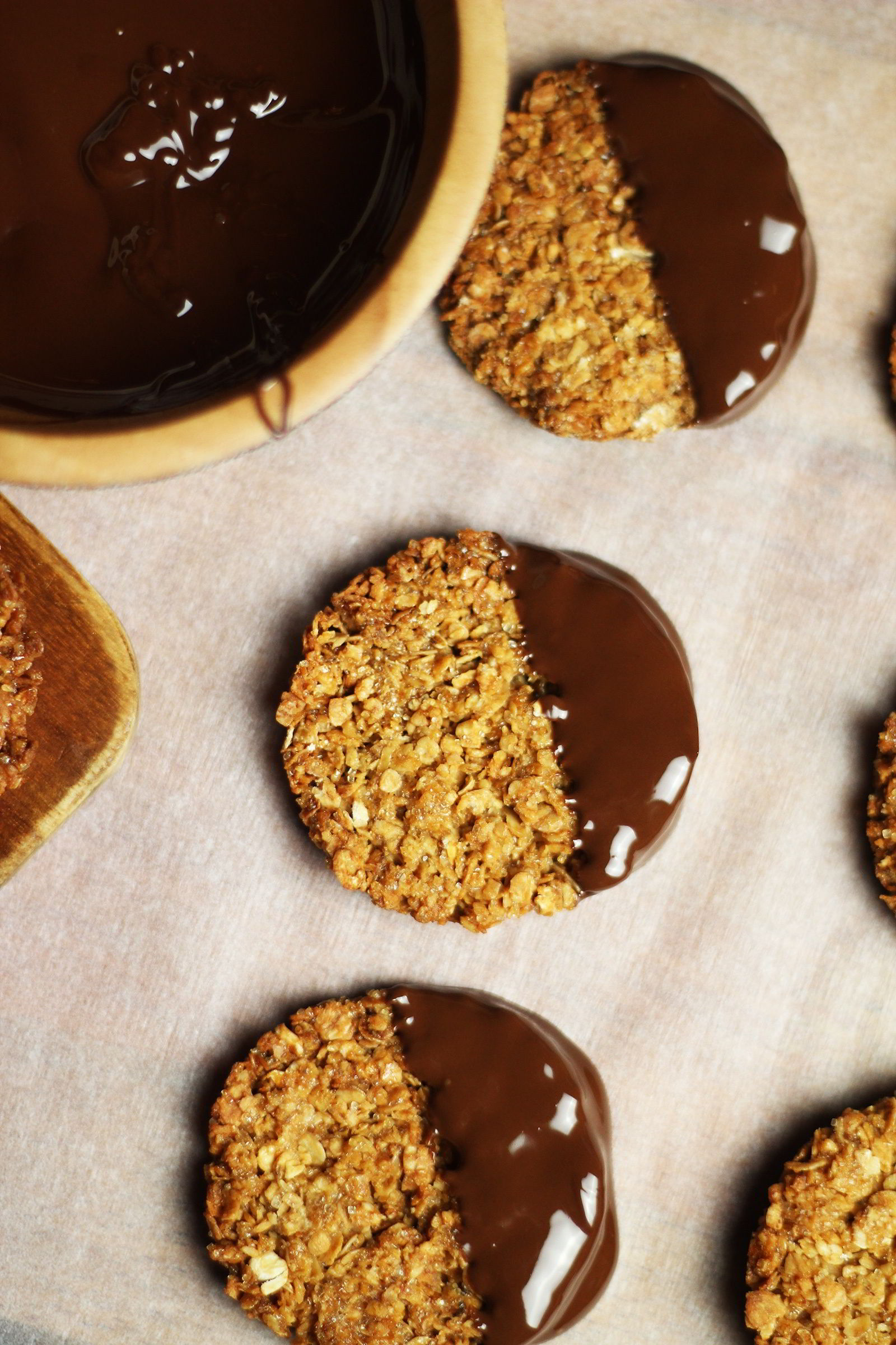 - Τις βουτάμε (κατά το ήμιση) στην κουβερτούρα και τις αραδειάζουμε στη λαδόκολλα μέχρι να σταθεροποιηθεί η κουβερτούρα.