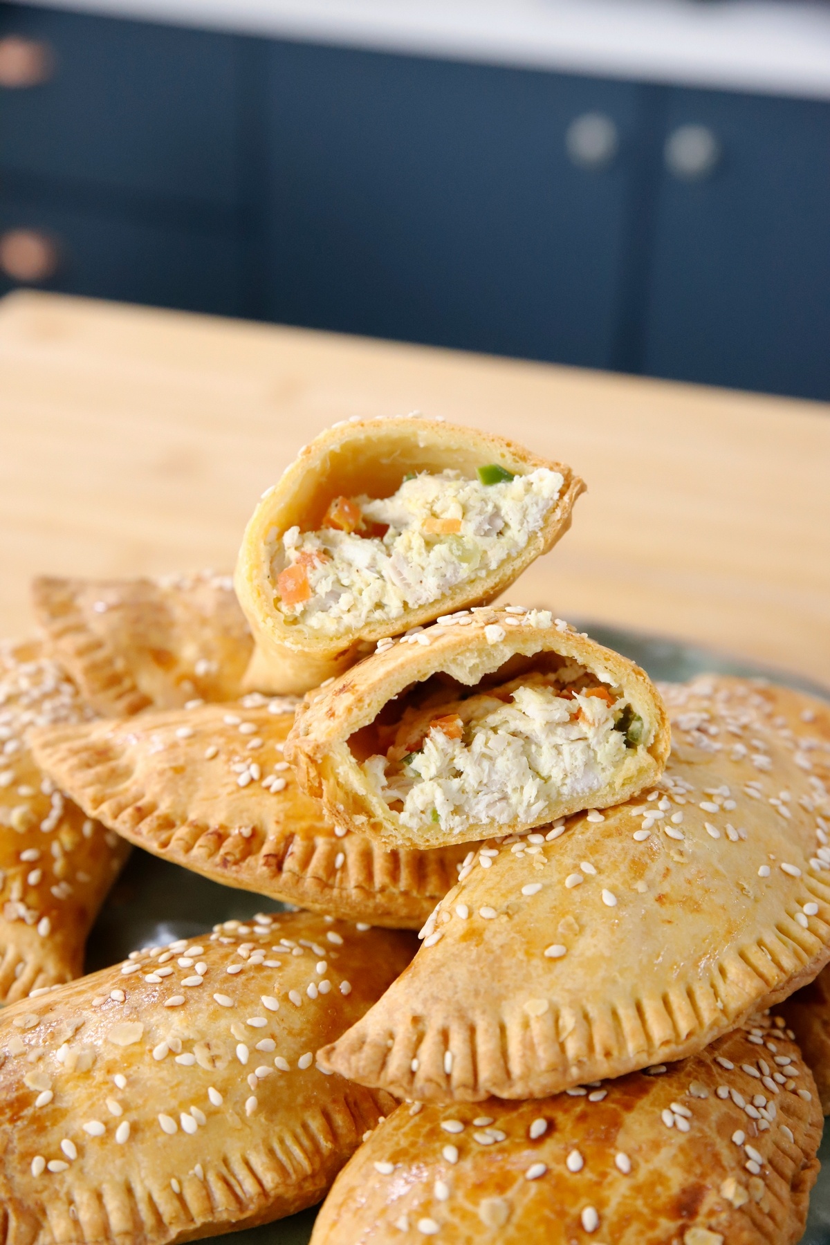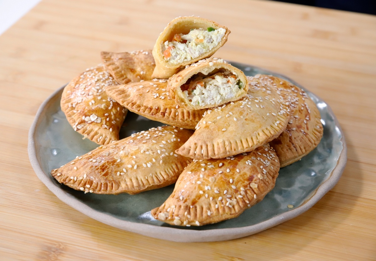 Κοτόπιτες με ζύμη κουρού, πλούσιες σε πρωτεΐνη από βρασμένο κοτόπουλο και τυρί κρέμα, ενισχυμένες με τραγανά λαχανικά όπως καρότο, πιπεριά και σέλερι. Το ελαφρύ άλειμμα με αυγό και το πασπάλισμα με σουσάμι και βρώμη δημιουργούν μια απολαυστική, τραγανή υφή.